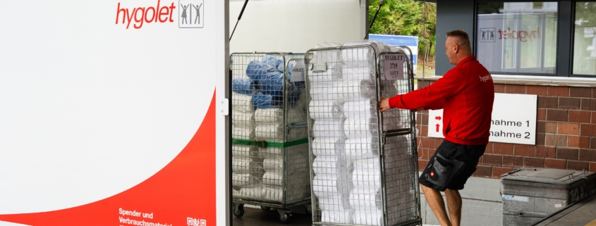 À 8 heures, Ermin atteint sa première destination, un gymnase. Ici, il effectue le service d’hygiène féminine. Les conteneurs à déchets Sanifem pour l’hygiène menstruelle sont vidés, nettoyés, puis équipés de nouveaux sacs poubelles et de sachets désodorisants neutralisant les odeurs. Il doit également installer un nouveau distributeur de savon dans le vestiaire. Direction ensuite un cabinet médical. Là, c’est le service de siège hygiénique qui est au programme. Ermin nettoie le siège de toilette hygiénique et change le rouleau de plastique. Le nouveau film est soigneusement mis en place pour que le système fonctionne parfaitement et que chaque utilisateur trouve toujours un siège propre. Chez une compagnie d’assurance puis dans un centre de recyclage, c’est le service d’essuie mains en tissu qui suit. Ermin change les rouleaux usagés de tous les distributeurs d’essuie-mains textiles et les remplace par des rouleaux propres. Il emporte les anciens rouleaux pour le nettoyage. La dernière étape avant midi est une administration communale. Ici, c’est le service de tapis de protection qui est prévu. Les tapis sales aux entrées sont remplacés par des tapis propres et emportés pour un nettoyage professionnel.