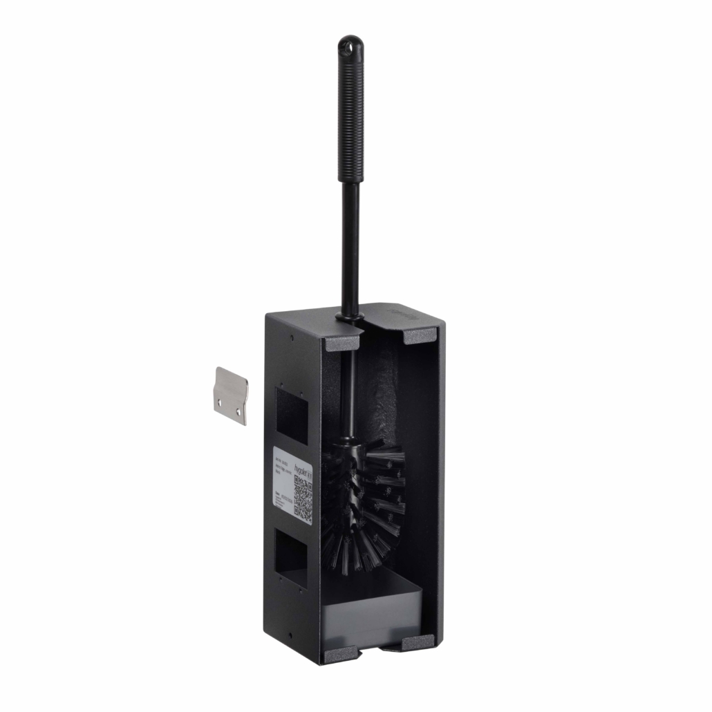 WC-Bürstenset aus pulverbeschichtetem Edelstahl für einfache Handhabung. Wandmontiert oder freistehend für optimale Hygiene und Flexibilität.